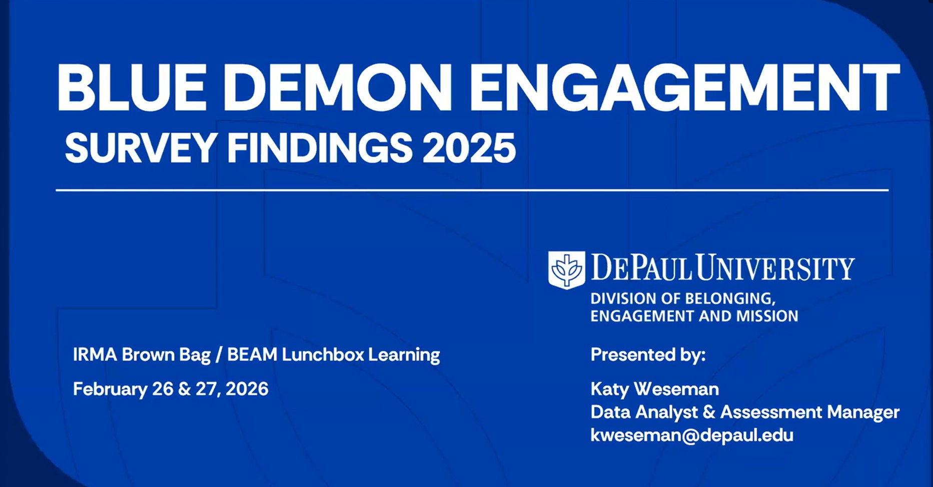 Our mission is to frame and inform the institutional strategic dialogue in active partnership with colleagues, building a culture of evidence to support planning and management, as agents of change at DePaul and in higher education generally.